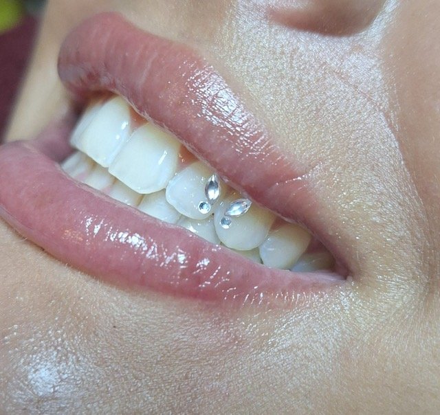 Een klein Swarovski-steentje of diamantje wordt met een speciale, tandvriendelijke lijm op de tand bevestigd — volledig pijnloos en veilig.